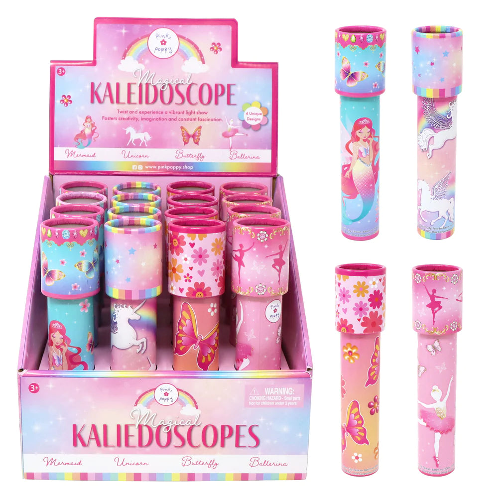 Dazzle and delight your eyes with Pink Poppy Magical Kaleidoscopes. 4 beautiful illustrated designs (unicorn, mermaid, butterfly and ballerina.) Each design has a different coloured light show. Twist the kaleidoscope to adjust the colourful beaded pattern inside. Each turn creates a magical light show of, iridescent colourful mosaics that will delight and amaze. A timeless gift that's educational and entertaining.