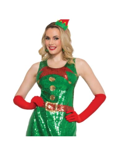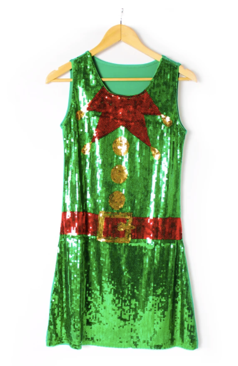This Christmas Sequin Dress (Elf) is the perfect thing to wear to get you into the festive spirit this Christmas season! The front is fully sequinned and features the classic trims of a Christmas Elf including a red belt with gold buckle. The back is plain green (no sequins) and is stretchy to help fit multiple sizes.