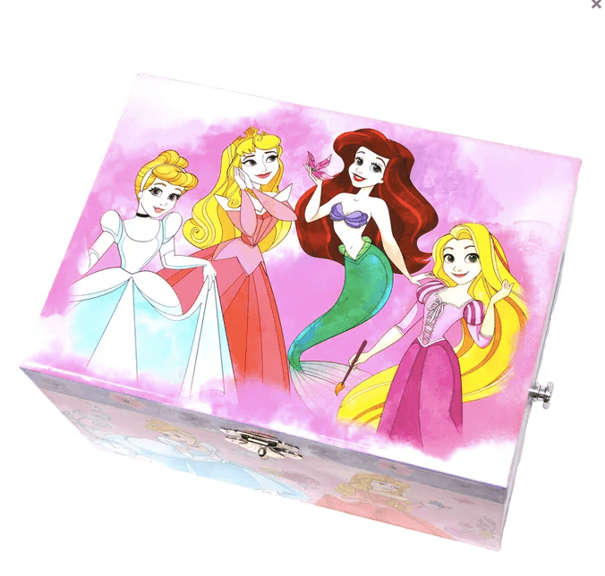 Inspired by Disney Princess. Your little royal will love to store their precious gems and accessories in this Luxury Musical Jewellery Box. Featuring detailed illustrations of your favourite Disney Princesses: Sleeping Beauty, Ariel, Rapunzel, & Cinderella.