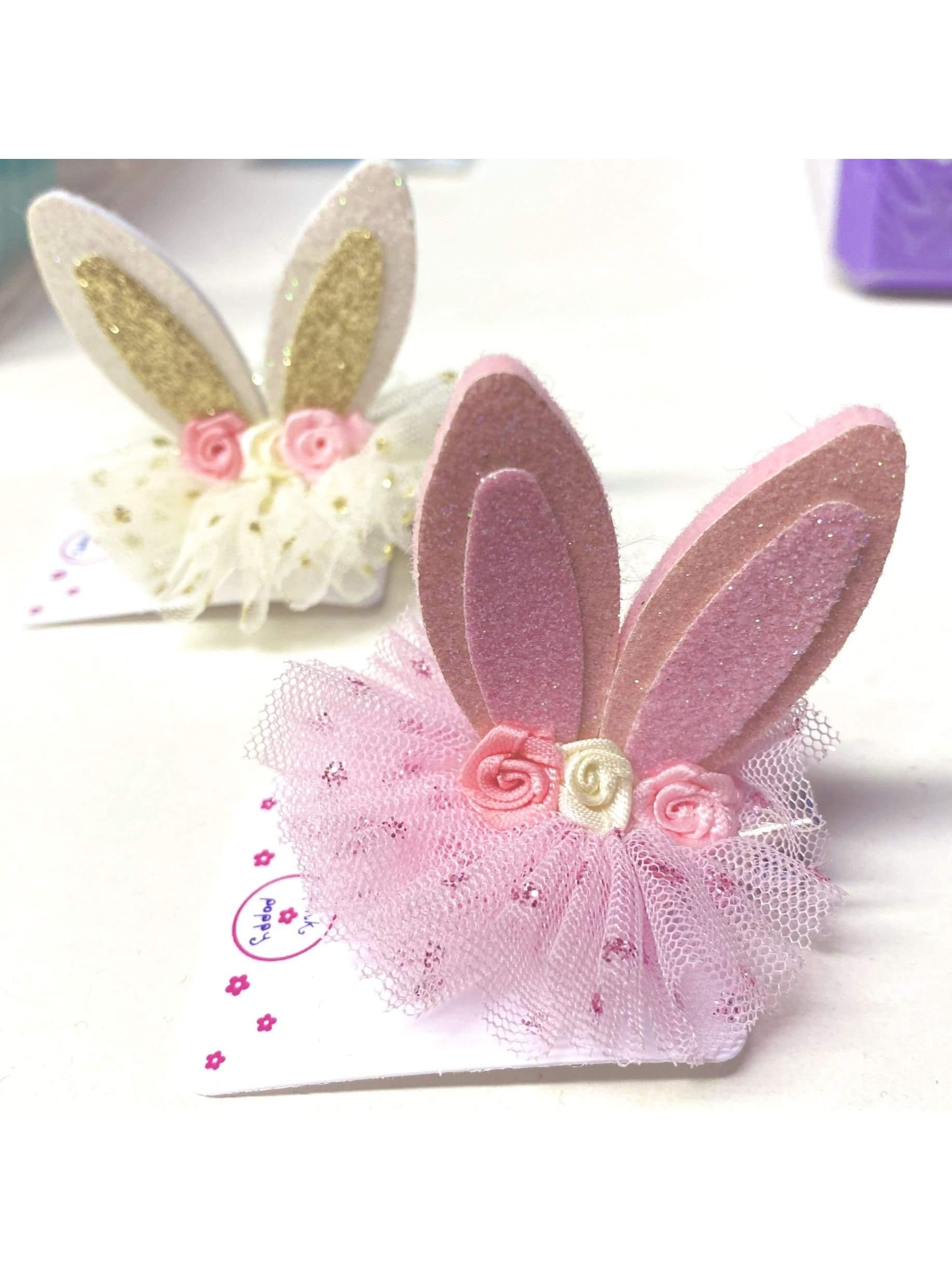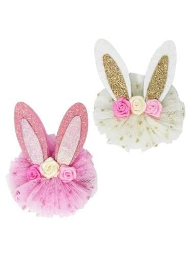 Floral bunny hairclips in a tub featuring glittered ears - Multi coloured silk flowers and tulle adorn these gorgeous bunny inspired hair clips Three rose look silk flowers - Gathered glittery tulle tuft. 1 per pack. colour selected at random, depending on availability.