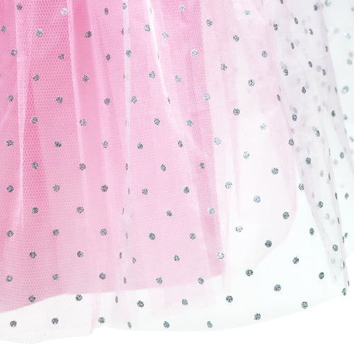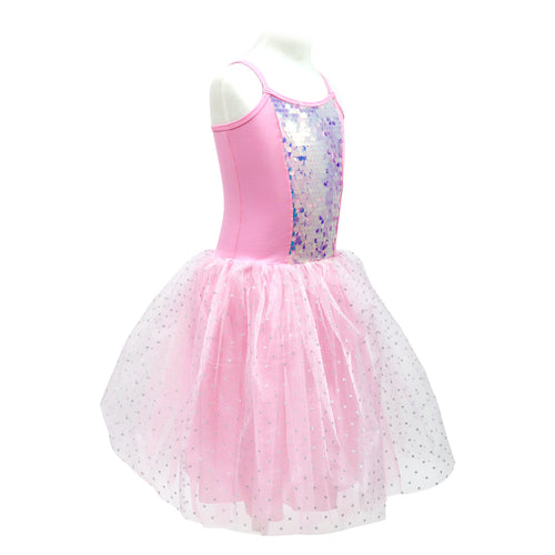 An eye-catching and elegant piece. This Romantic Ballet Sequinned Party Dress is embellished with an iridescent disc sequins centre panel. The long style skirt features silver glitter spotted organza, voluminous tulle under layers and a silky lining. While the elastic enclosed waist and adjustable shoulder straps make the perfect fit.
