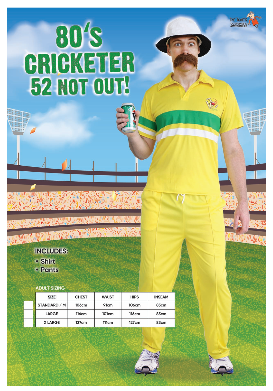 Gear up for a nostalgic trip to the cricket field of the 80s and make a statement with this eye-catching ensemble. Whether you're reliving the glory days or just having some fun, this costume is a fantastic choice for any cricket enthusiast.