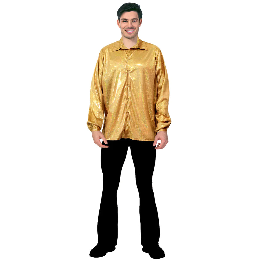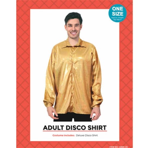 Get down and boogie in this Adult Disco Shirt in Gold Perfect for a 1970s party with big disco vibes!