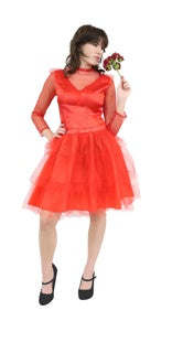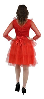 Item Includes: Dress. Fit and Sizing: Fabrics and Care: 100% Polyester. Hand wash, hang dry. Say your groom's name three times. When you're marrying the ghost with the most, you're going to need to right dress to marry him in, which is why you will need this Beetle Bride Womens Costume. Just the right dress for someone tying the knot with a ghost, this costume comes with a red knee length dress. The dress comes in a satin finish and features a tiered tulle skirt, bodice with lace detail and a high neck and around the back is a large red bow. Suit your groom in his iconic black and white striped suit as you walk through the graveyard to recite your vowels.
