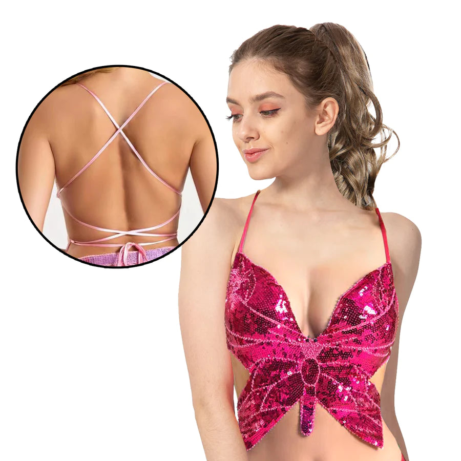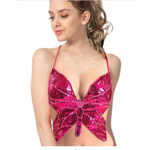 SEQUIN BUTTERFLY TOP (HOT PINK) Bring on the glitz and glam in our Adult Sequin Butterfly Top. It's the perfect thing to wear for Mardi Gras and festival raves! The front is fully sequinned with a butterfly wing pattern. It's backless with criss cross straps. The shining sequins will look fabulous for any theme especially for LGBTQI Pride March! Pair it with one of our sequin fringe skirts for a fun party look! Pack includes: 1 x Adult Sequin Butterfly Top Approx. Dimensions: ONE SIZE fits most