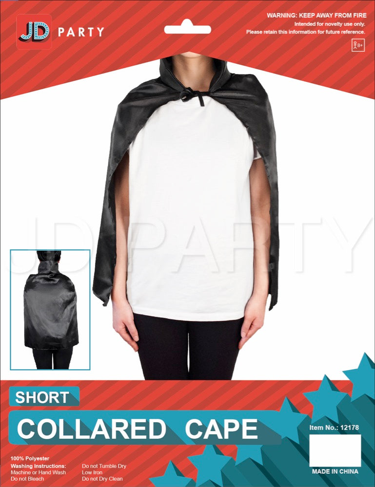 Our short length black satin cape is a great finishing touch to your dress up costume! Halloween, super heroes, vampires, witch and wizards all need to have a cape whether they're good or bad!