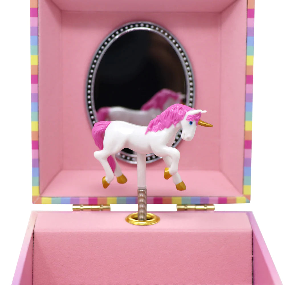 Pink Poppy's Unicorn Dreamer Small Musical Jewellery Box is a gorgeous keepsake portraying beautiful illustrations of Unicorns dancing in the pastel rainbow background sky. It features an oval mirror and a flocked interior. The wind-up design plays the classic tune 'Dance of The Sugar Plum Fairy' whilst the Unicorn figurine twirls delightfully.
