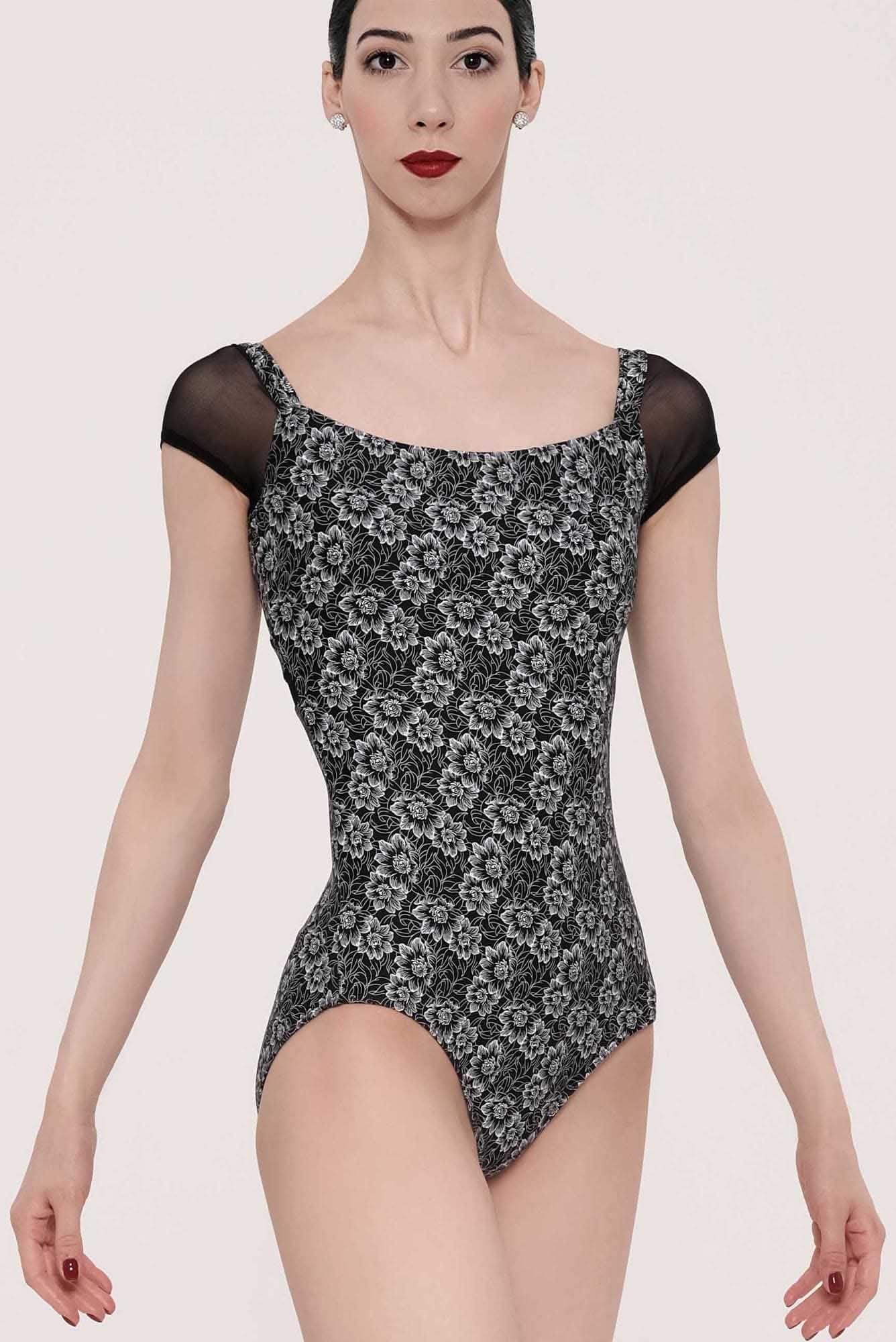 It is cut from extra-soft microfiber featuring a whimsical floral print and transparent stretch tulle. The tulle adorns the sleeves and a thin border in the back.