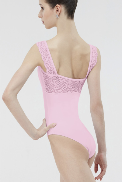 The Erine Leotard is a Tank leotard with a scalloped trim lace overlay.