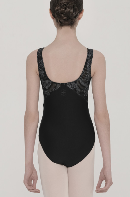 Medium strapped leotard featuring floral motifs printed on stretch veil with fine opaque lines raised above bust and an open back. Full front lining.