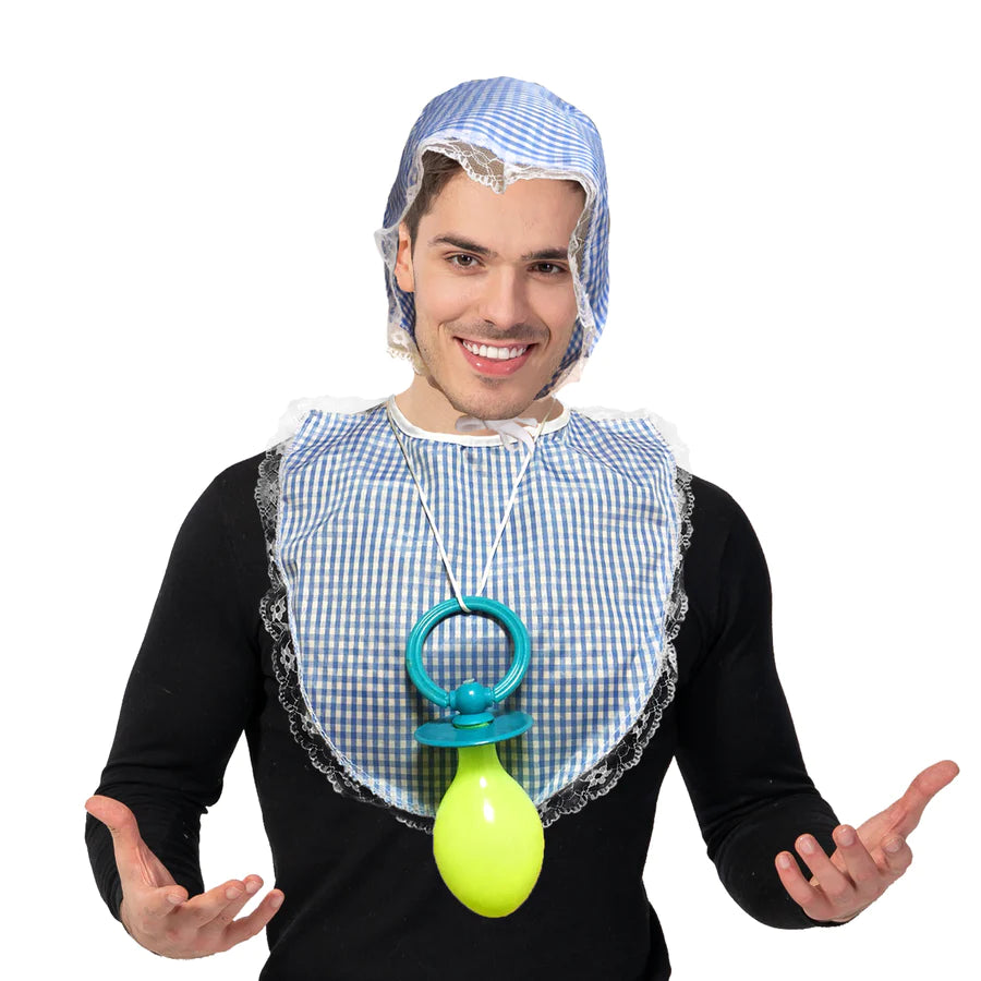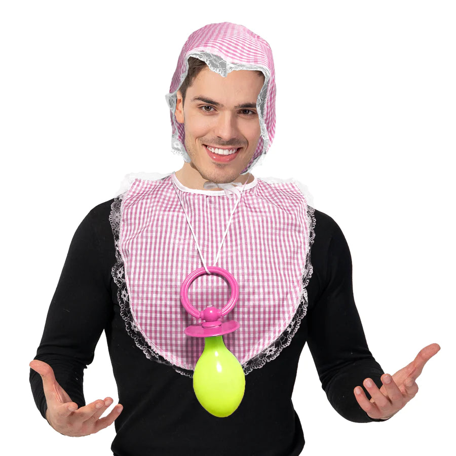 This Adults Big Baby Accessory Kit in Pink will have you and your friends laughing! This novelty set includes a gingham patterned bonnet and matching oversize bib and giant dummy to transform you into a big baby. Includes:Bonnet, Bib, Plastic Dummy