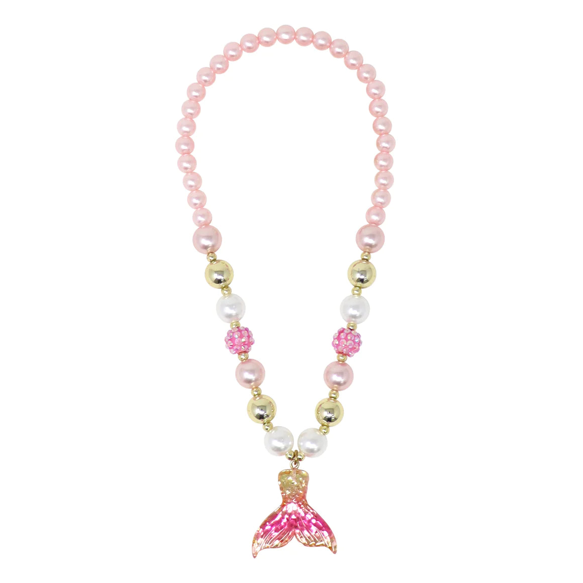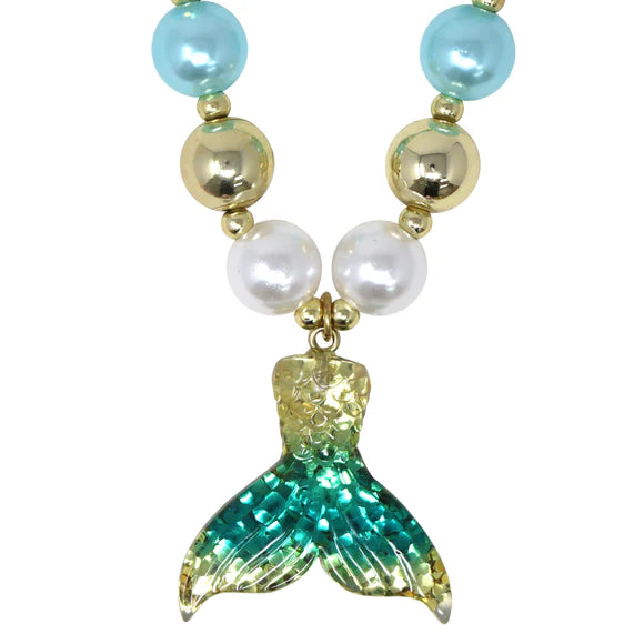 Pink Poppy's Mermaid Tail Necklace is perfect for the mermaid-loving girl comprised of lustrous pearl beads and a glitzy resin mermaid tail pendant. Specifications - Size: 16-inch circumference - Color: Available in Pink and Blue - Stretch Elastic Fit - Assortment of various bead finishes - Brand: Pink Poppy - Material: 99% plastic, 1% metal - Care: Wipe with a dry cloth - Age: Recommended for ages 3+
