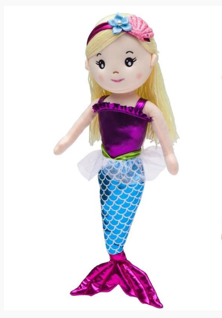 The mermaid plush toy with long, flowing hair is an enchanting and adorable creation that captures the imagination of anyone who lays eyes on it. This plush mermaid doll comes with a soft tulle tutu skirt, iridescent scales and a shell adorned headband. She is soft and cuddly and is the perfect size to be cuddled and cherished by children and mermaid enthusiasts alike. Surface Washable Fabric is 100 % polyester Filling is 100% polyester Size is 57cm