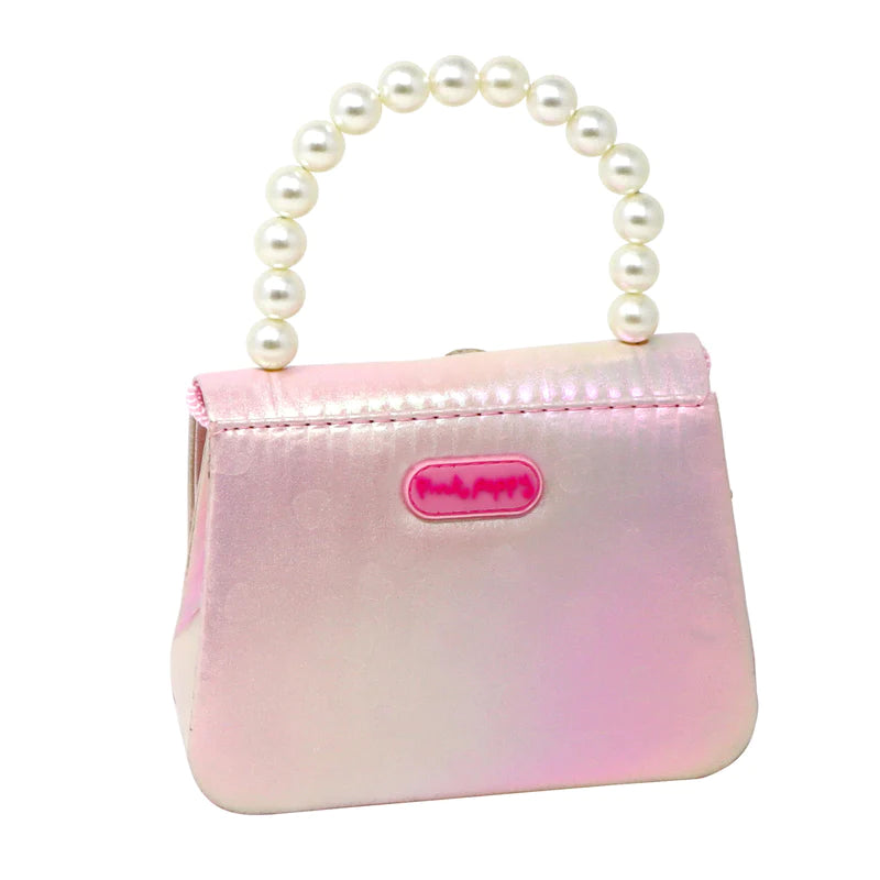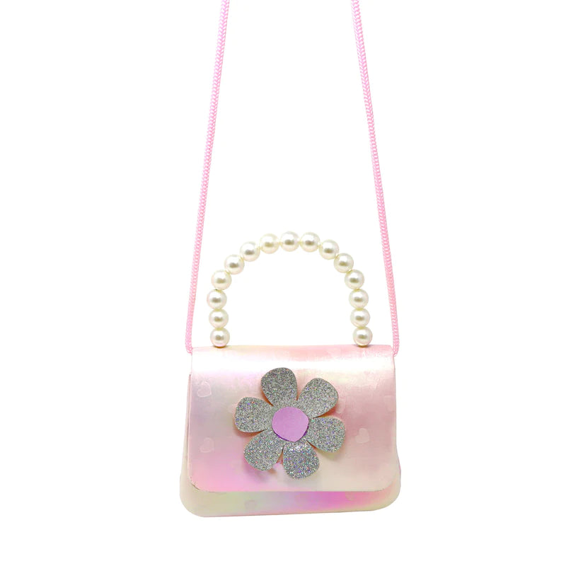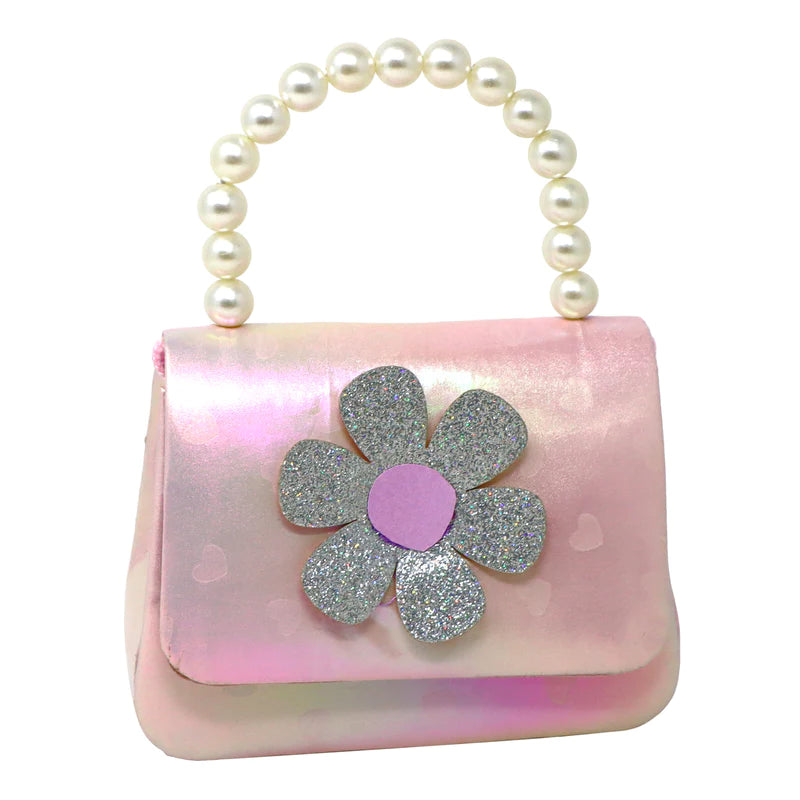 This iconic Pink Poppy's Ballerina Boutique Handbag is decorated in shiny pink fabric with a glittering silver 3D flower embellishment. Completed with an elegant pearl handle, magnetic stud for easy closure and an additional cord shoulder strap for hands-free play,  it is the perfect accessory for any occasion.