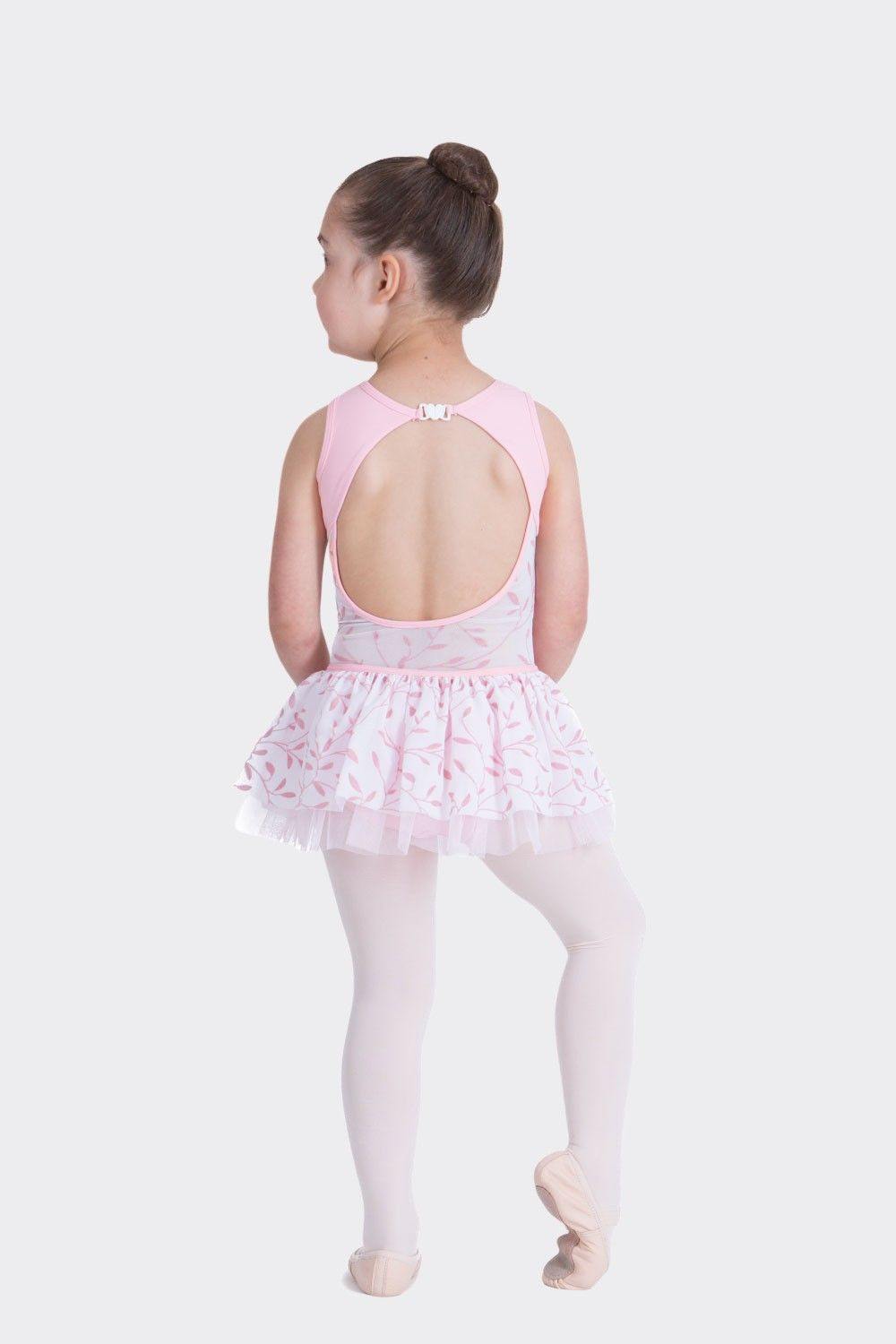 TACTEL, lined. Cap sleeve leotard with open crossover back. Leaf pattern print on light mesh.