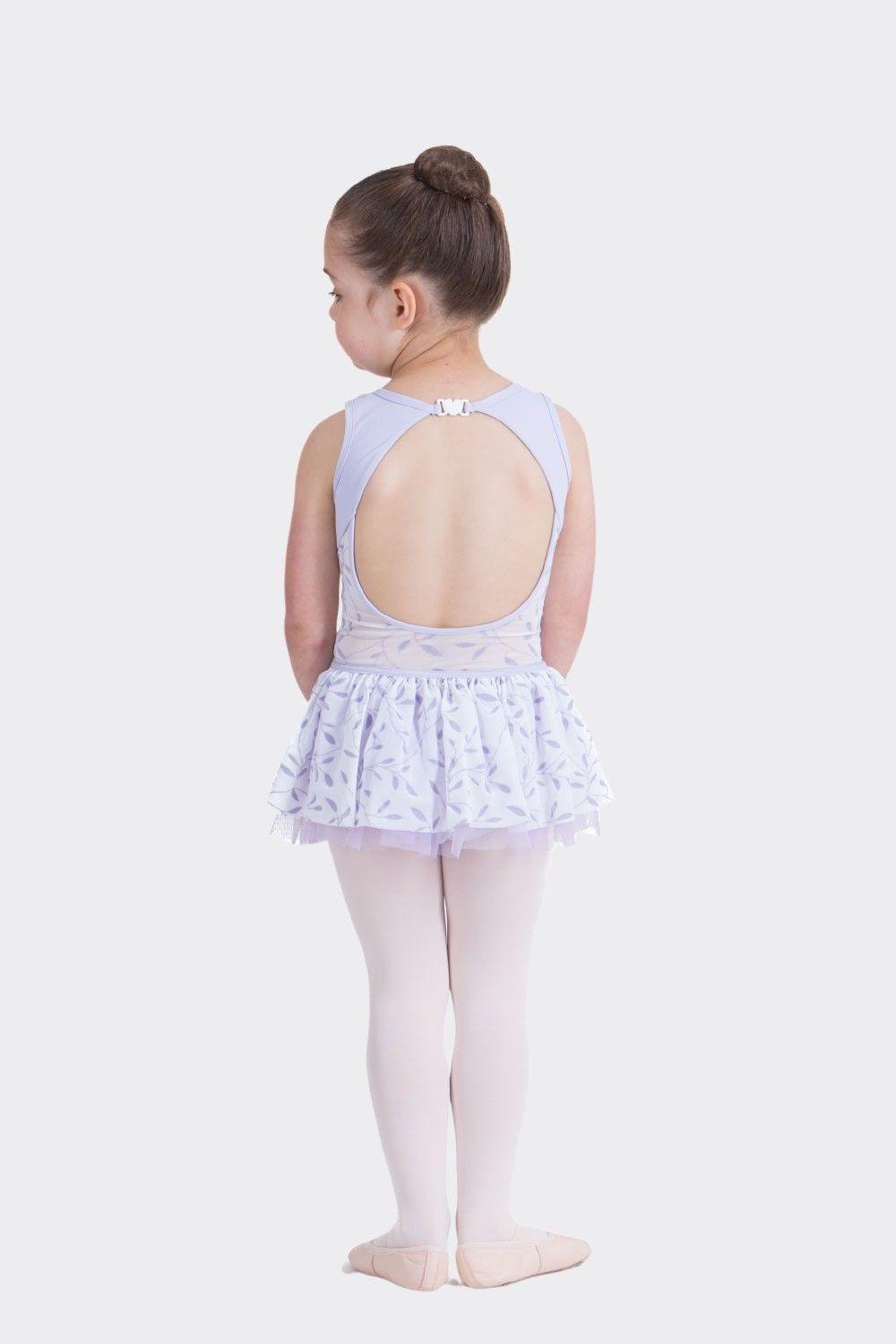 TACTEL, lined. Cap sleeve leotard with open crossover back. Leaf pattern print on light mesh.