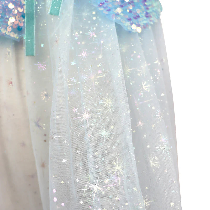 The Disney Frozen Elsa Cape is the perfect accompaniment to a party dress and an essential dress-up accessory to add to their Disney Frozen wardrobe. Featuring a gathered tulle layer on the neckline with a soft blue tulle with blue neck ties. The cape is generously gathered and adorned with a sparkly snowflake pattern. The snowflake cape shimmers and shakes with dance and movement.