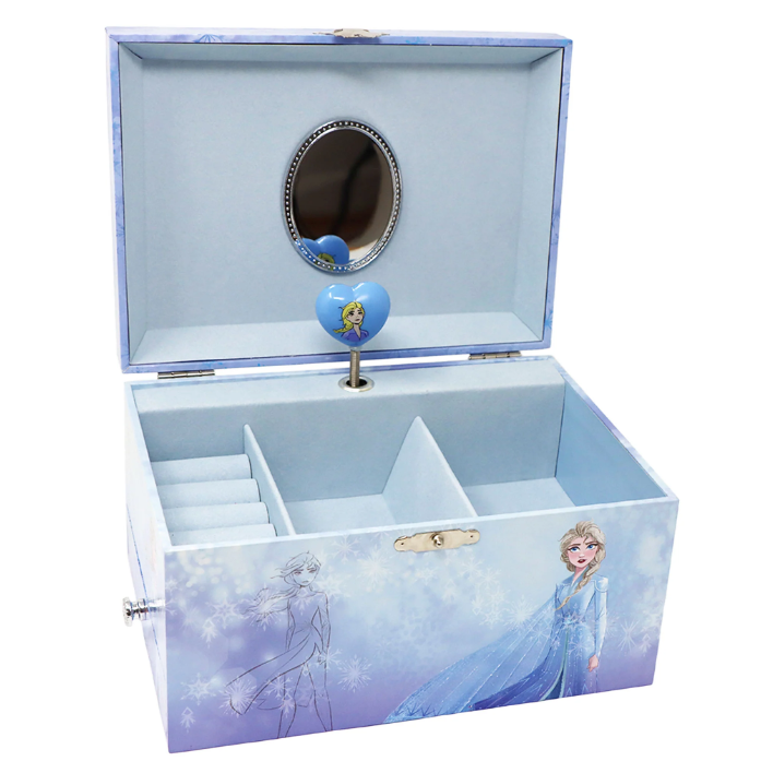 Disney Frozen Destiny Awaits Luxury Musical Jewellery Box, features the most loved characters from Disney's Frozen 2; this musical jewellery box has a mixture of watercolour illustrations and CGI, making it appealing for both young and old. A flocked lining protects your precious jewellery. Perfect for keeping your treasures safe! It has 2 side draws, a ring compartment, a divided jewellery compartment, a mirror & a rotating printed heart figure with Elsa print that spins to the tune of Waltz of The Flowers. Specifications: Number of Pieces: 1 Size: 19.8W x 11.1H x 14.5D cm Material: 69.5% MDF, 16% Paper, 11.5% Metal, 2% Plastic, 1% Others Brand: Disney Frozen Battery: No Battery Used