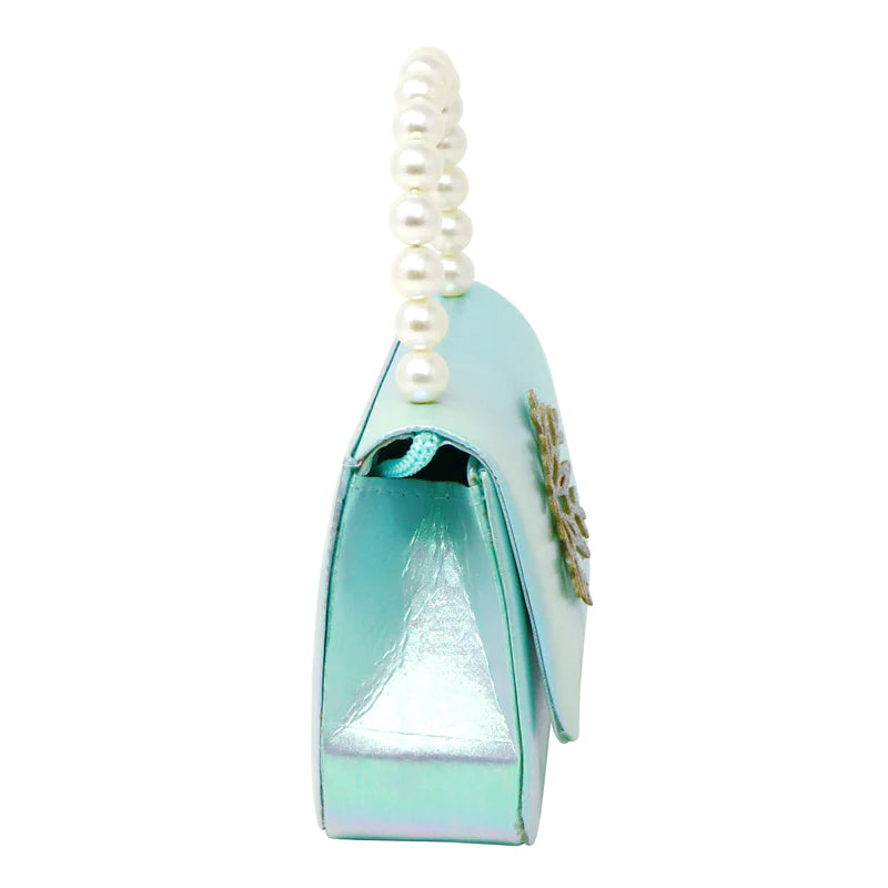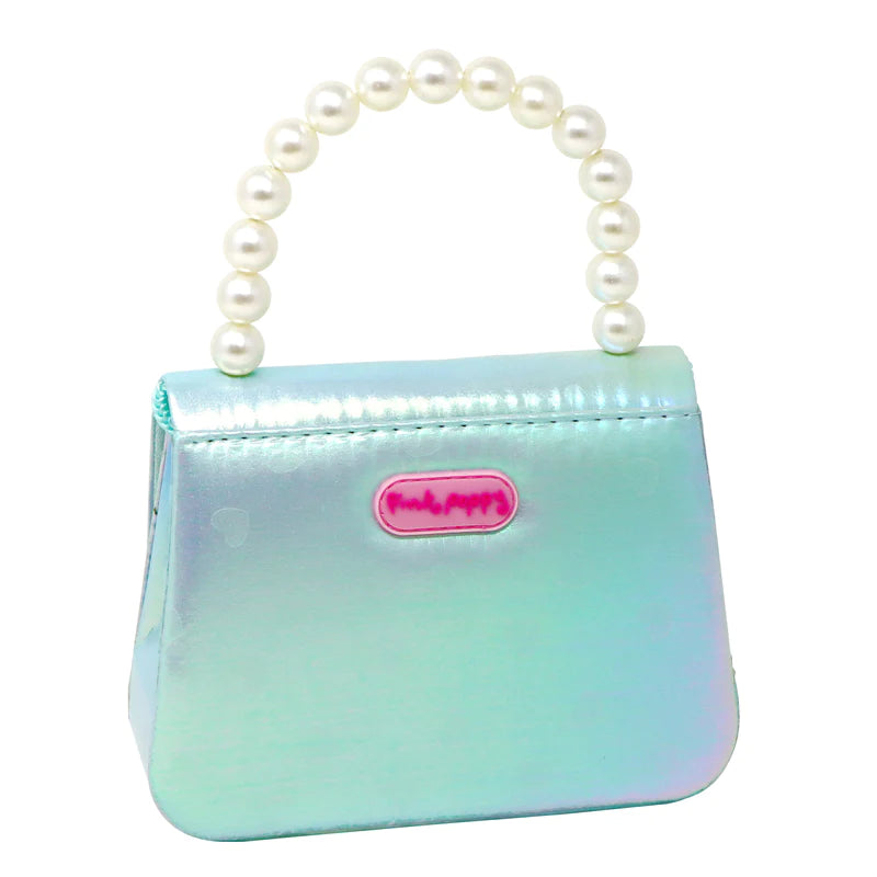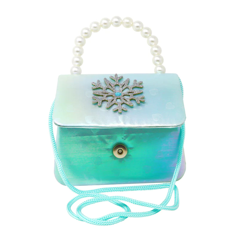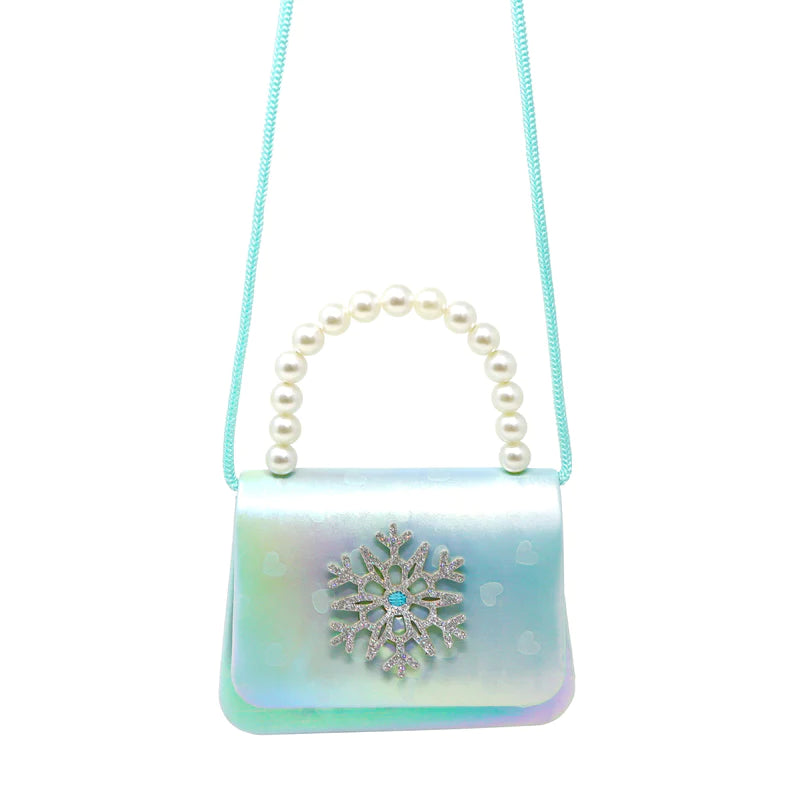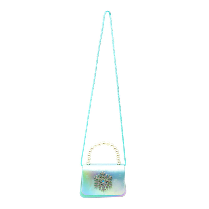 This iconic Pink Poppy's Snowflake Handbag is decorated in shimmering blue fabric with a glittering silver 3D snowflake embellishment. Completed with an elegant pearl handle, magnetic stud for easy closure and an additional cord shoulder strap for hands-free play,  it is the perfect accessory for any occasion.