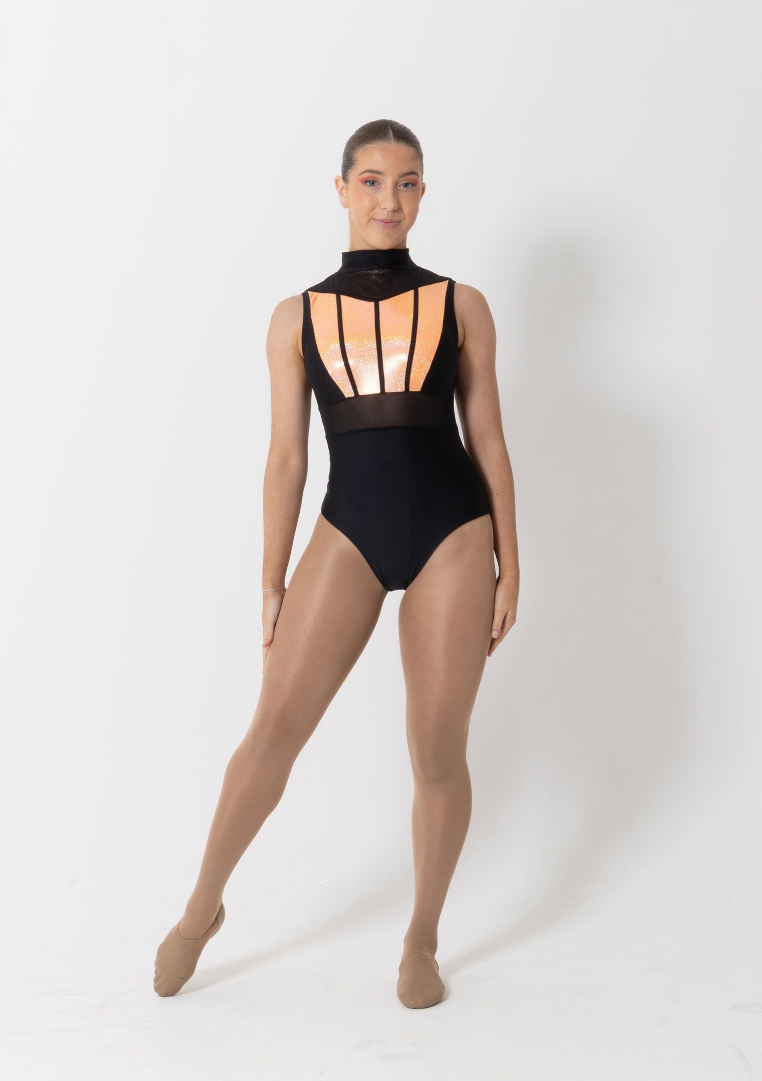Shine under the lights in the Helena Leotard. Designed to dazzle for jazz, tap, or any high-energy performance, this bold black leotard features brightly coloured, iridescent sparkly panels that catch the light from every angle.