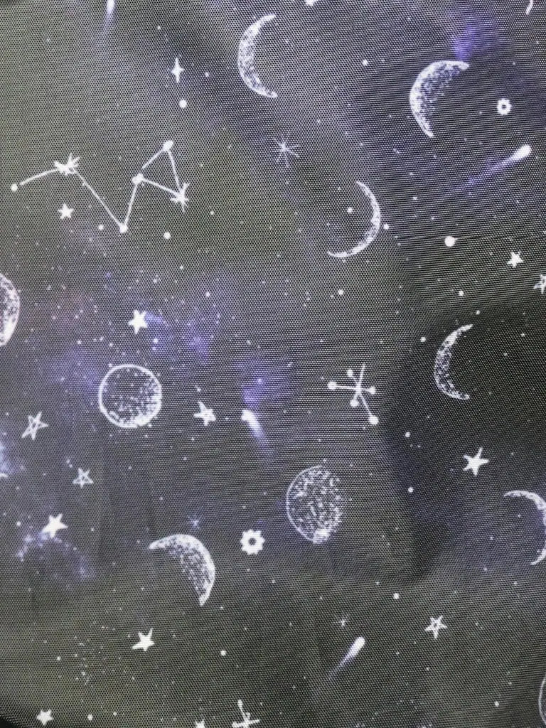 Cosmic outer space lining. Exterior and interior pockets. Zip closure.