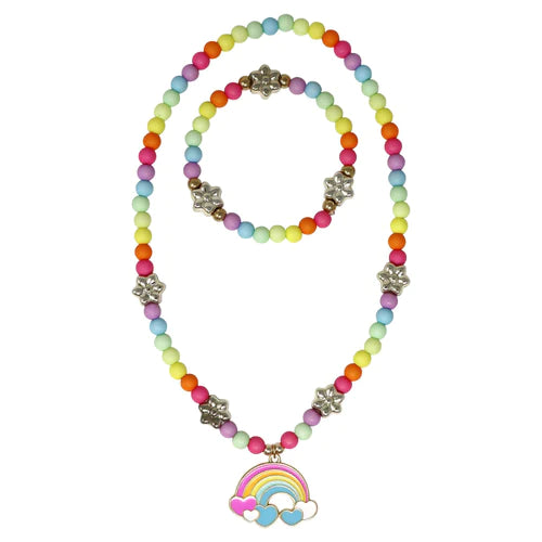 Daisy Rainbow Necklace and Bracelet Set. This colourful daisy rainbow bracelet is the perfect daily accessory. Bright coloured beads with shiny gold metallic daisy beads adorned with a cute metal rainbow charm.
