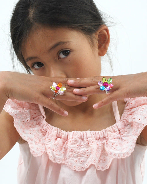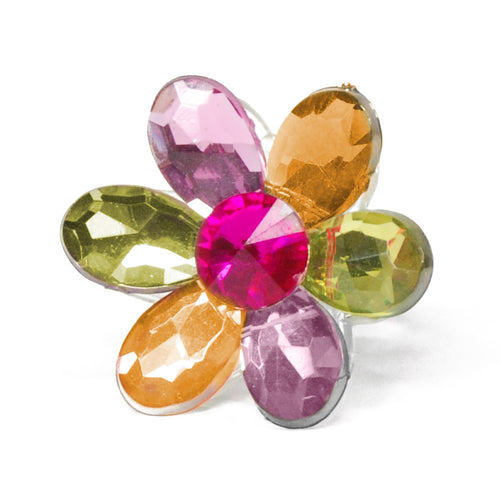 Add some BLING to her outfit with this unique oversized style Daisy ring suitable for kids and tweens alike. It can be worn alone or stacked up with other rings. The flower shape is made from multi coloured sparkling acrylic gemstones that are dazzling in the light.