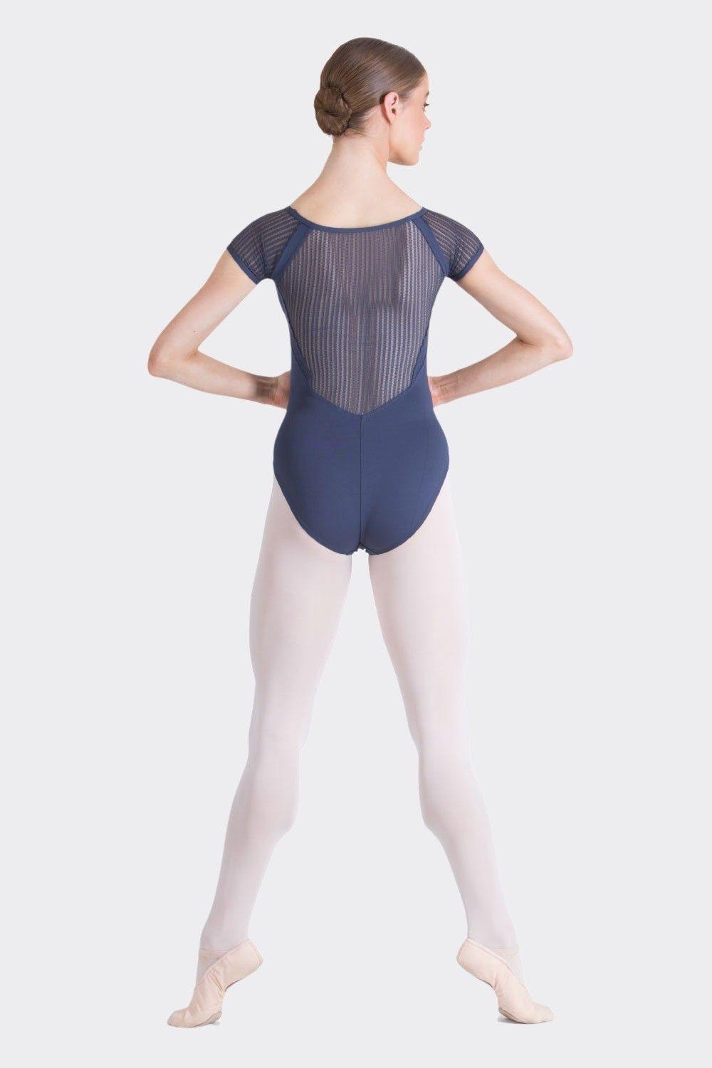 TACTEL, lined. Cap sleeve leotard with open back mesh.