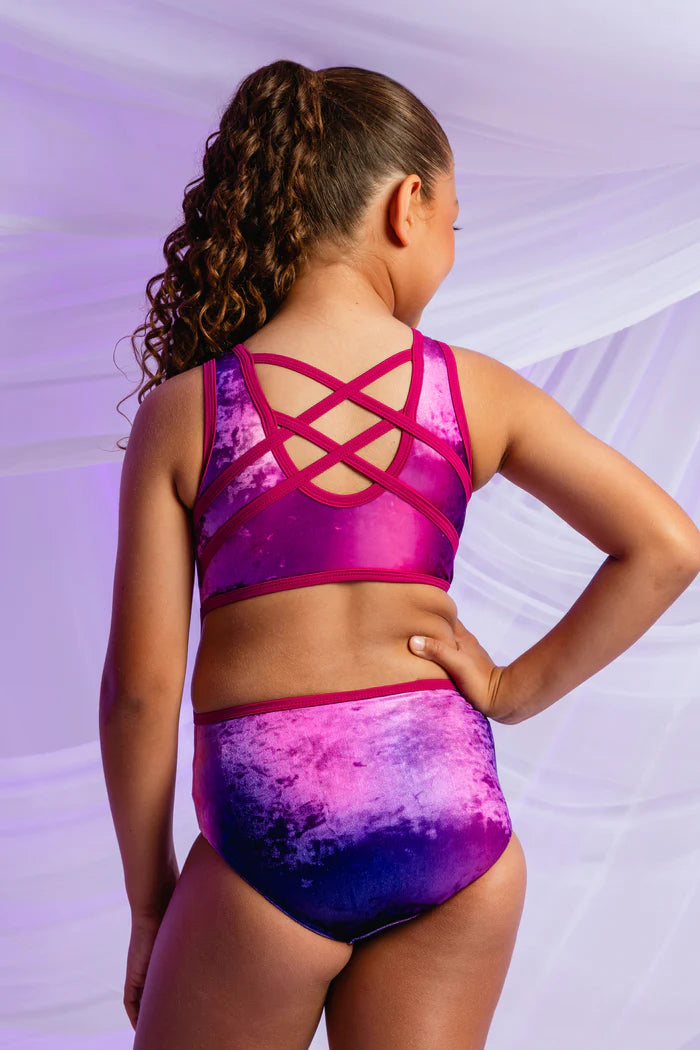 Step into a world full of mystery, magic and endless possibilities in the Sparkle N Shine Leotard. Deep sugar plum tones twirl across this leo in a dreamy ombre. The print is topped with an exquisite sequin motif that dances across the body with sparkle and shine. Styled in a classic scooped neckline with side cutouts for a faux crop top look. The back has woven straps overlayed for that total wow factor. We made this leo using a combination of our signature printed crushed velvet fabric that is durable and quick drying with a firmer fit. We added a full front lining and elasticated legs for the ultimate coverage and comfort. SP branded logo on the front hip of this garment.