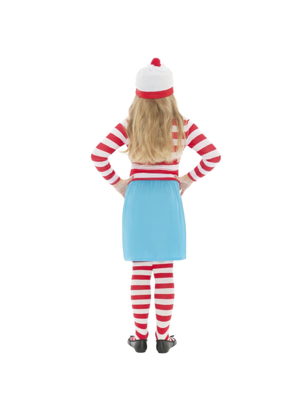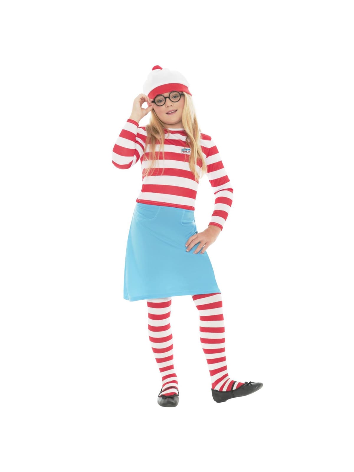 Where's Wally? everyone can be sure to pick you out from a crowd in Smiffys kids / girls licensed where's Wally? wenda fancy dress costume. This costume consists of a red and white stripy top with a pair of coordinating tights and a bobble hat. Also included in this cartoon inspired costume is a blue skirt and a pair of black glasses just like the illustration in the 'where's Wally?' children's books.