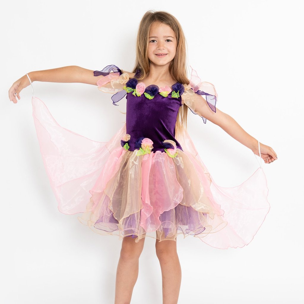 This plush deluxe dress is in a divine velvet fabric with oodles of organza in the skirt and wings. Dotted with pretty handmade flowers and petals. The wings are long enough hold and catch the wind for that imaginative flying experience, a wonderful style that is comfortable and beautiful.