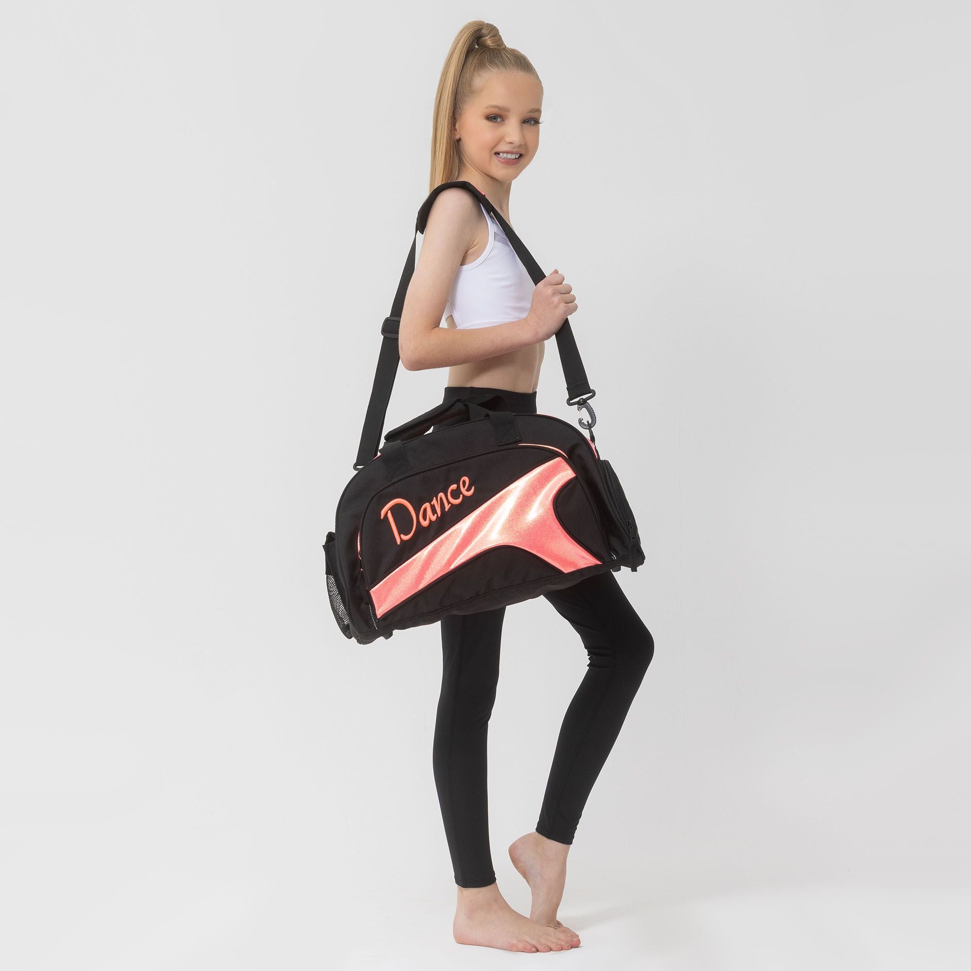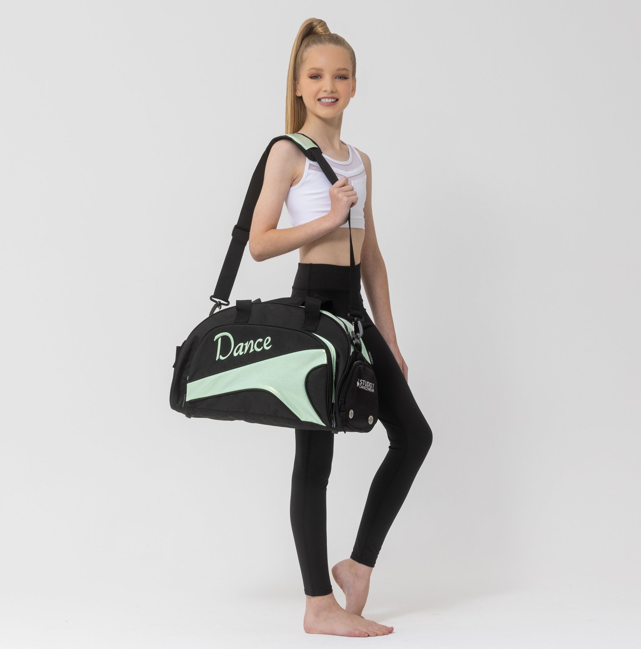 Our Eco-Friendly Junior Duffel Bag is made from recycled plastics. This stylish and popular dance bag features a ventilated shoe compartment, drink bottle holder, and phone and accessories pocket.