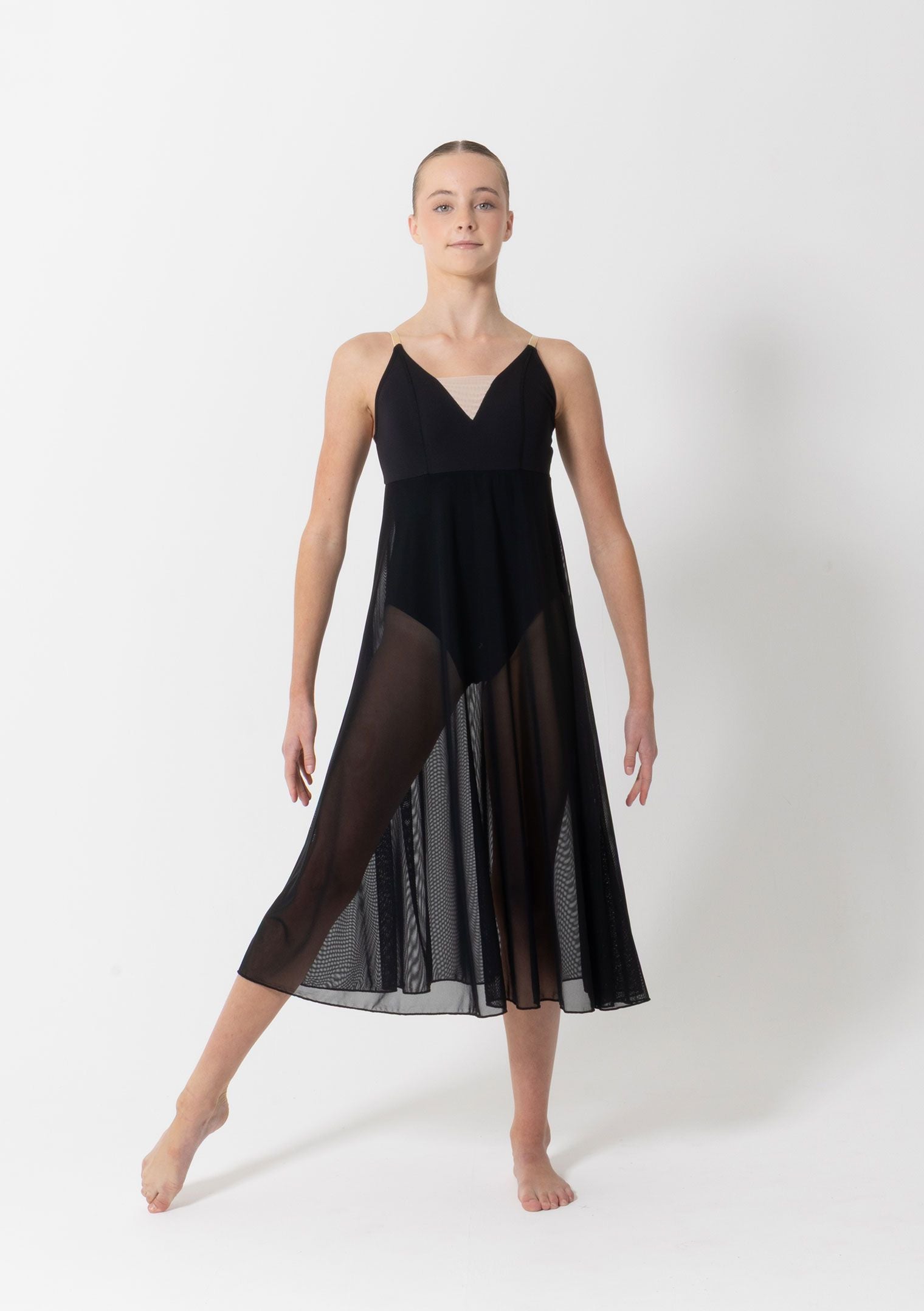 Grace meets simplicity in our ethereal Willow Lyrical Dress – a stunning choice for dancers who want to move beautifully and effortlessly. Designed for lyrical and contemporary performances, this elegant dress features a sleek camisole-strap leotard with a flattering V-shaped mesh detail that elongates the neckline with subtle sophistication.